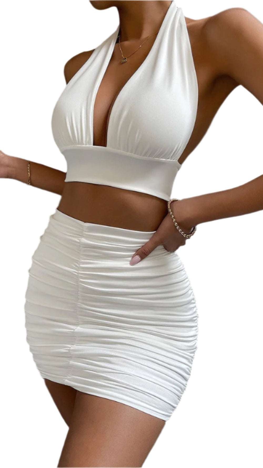 The skirt features a pleated hip-covering shape. This detail flatters every curve and sits comfortably on the waist. Made with soft, breathable fabric, the halter top and skirt set for women feels light and smooth. Wear it for parties, nights out, or even summer days.