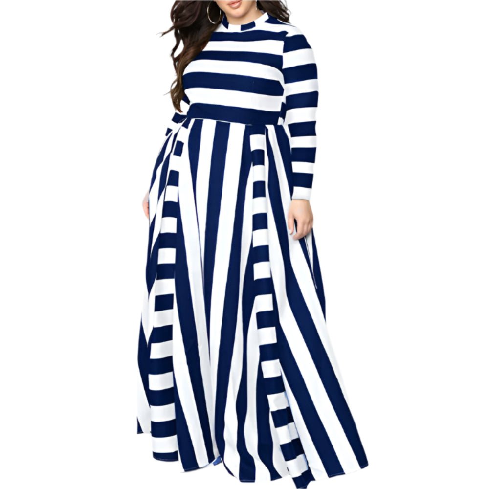This plus size striped maxi dress is easy to care for. The fabric holds its shape wash after wash. It is ideal for travel, work, or leisure time. Feel stylish and comfortable every time you wear it. Show off your unique style in this beautiful dress.
