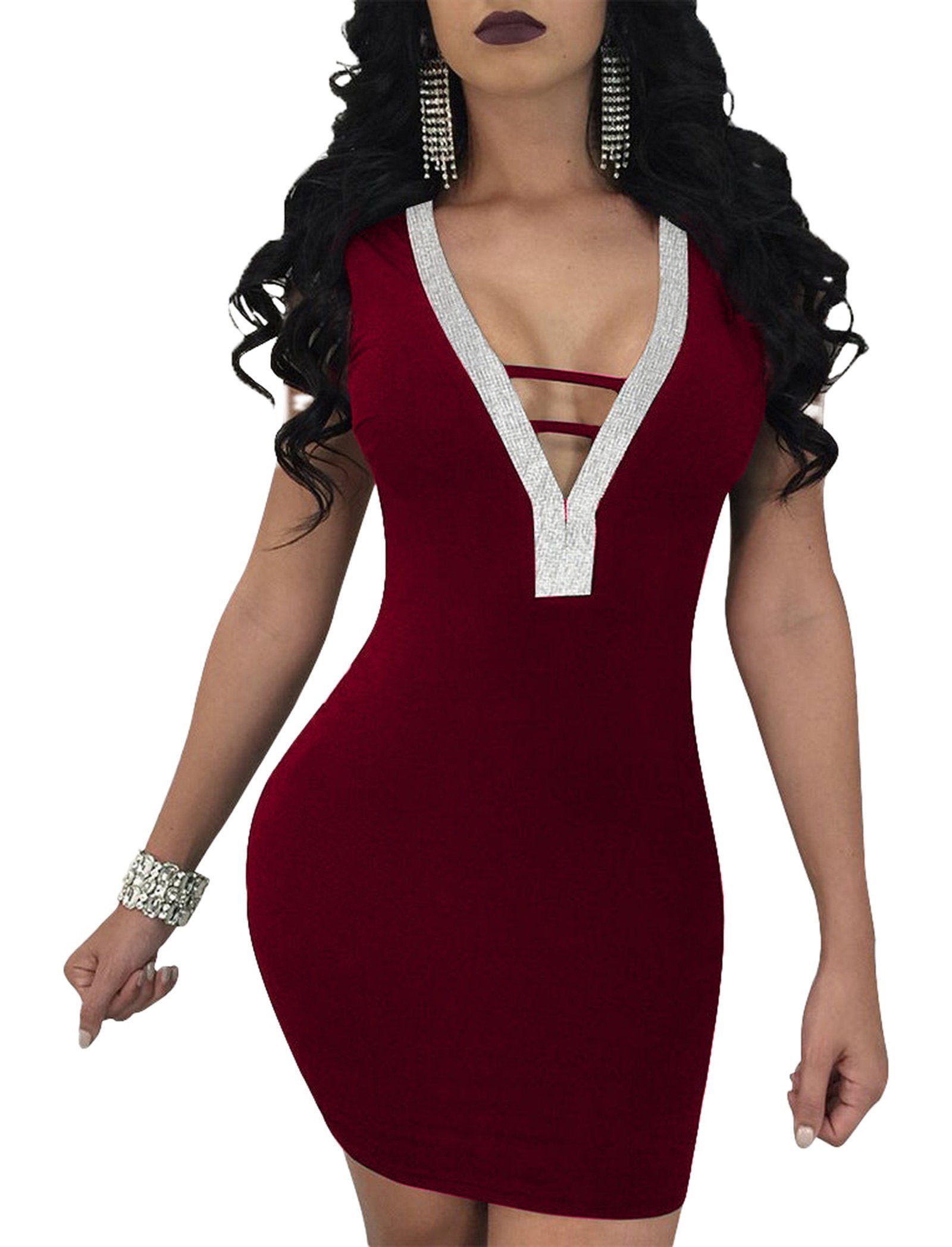 Turn heads with this sexy bodycon party dress for women. The deep V-neck design highlights your collarbone. The sleek fit enhances your curves. Enjoy a modern, sleeveless silhouette that keeps you cool. Sparkling trim adds a touch of glam to the neckline.